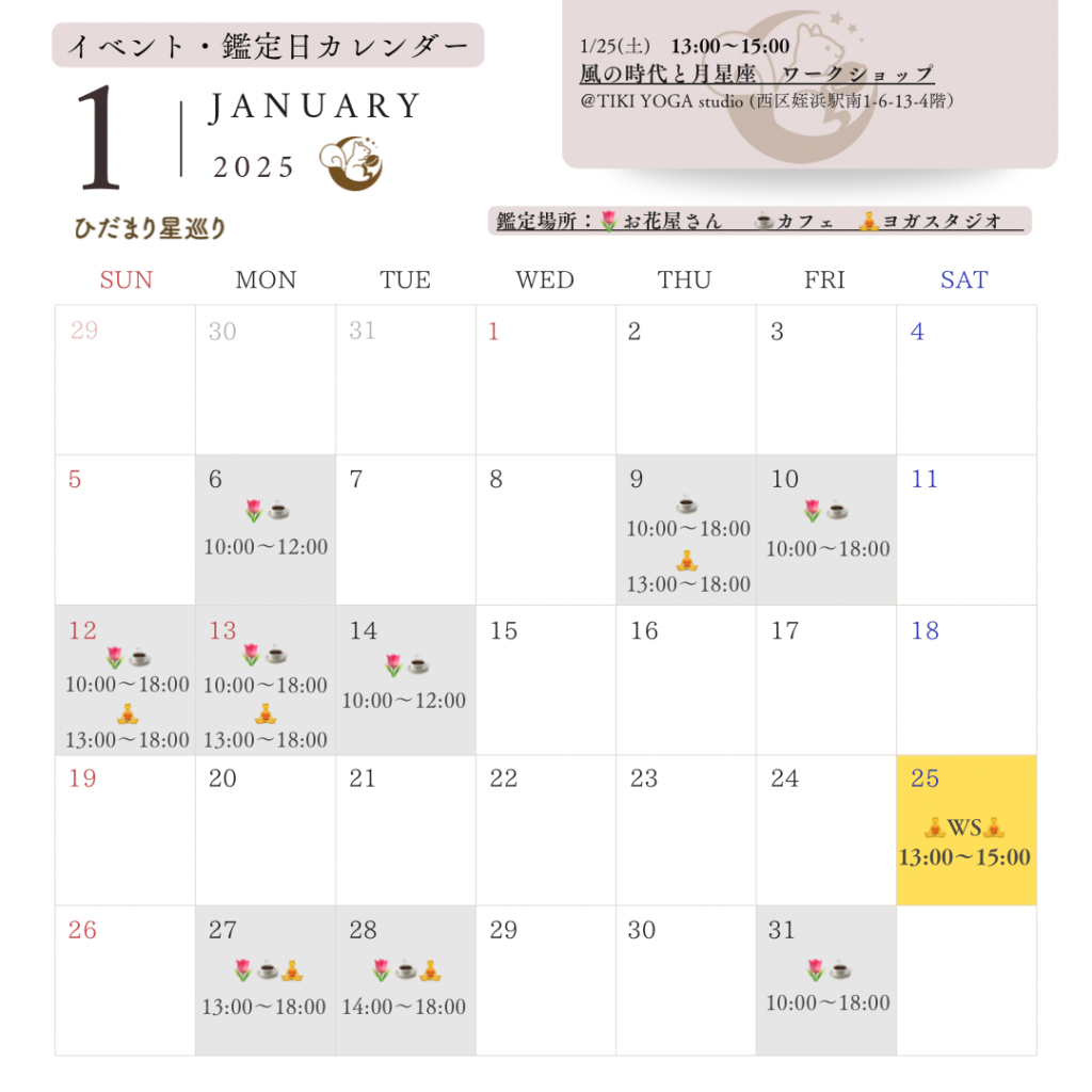 2025年は1月6日より鑑定・講座開始します。今月は稼働日が少なくなっていますのでご了承ください。