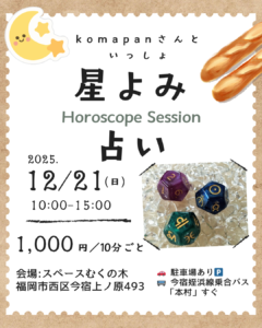 この記事を書いている時点で翌日の告知にはなりますが、どうか必要とされている方に届きますように☆彡願いを込めて。 2025年12月21日(日)10:00~15:00スペースむくの木 福岡市西区今宿上ノ原493駐車場あります […]